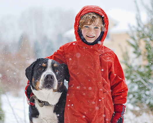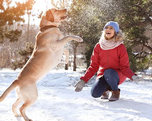 Bleib unterwegs in Bewegung, z.B. mit Ballspielen. Ein kleiner Ball in Neonfarbe hebt sich gut vom Untergrund ab. Bitte wirf keine Stöckchen, diese können splittern und den Hund verletzen. Du kannst auch Leckerlis im Schnee verstecken und deinen Hund suchen lassen. Auch als Begleiter für Skitouren oder beim Rodelspaß mit deinen Kindern ist Bello gern dabei – achte jedoch darauf, dass er nicht zum Hindernis für andere Skifahrer wird.